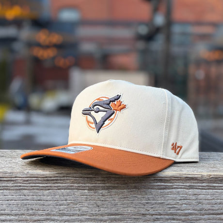 A nod to the Blue Jays ’70s roots, this retro-inspired dad hat pairs a burnt orange brim with an ivory crown and dark navy-grey tonal logo, capturing classic sunset ballpark vibes.