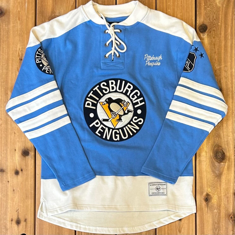 Exclusively ours—Celebrate the Penguins' storied history with this cozy vintage-inspired jersey sweater. This look is inspired by a hockey jersey, and features the Penguins original colors and logo.