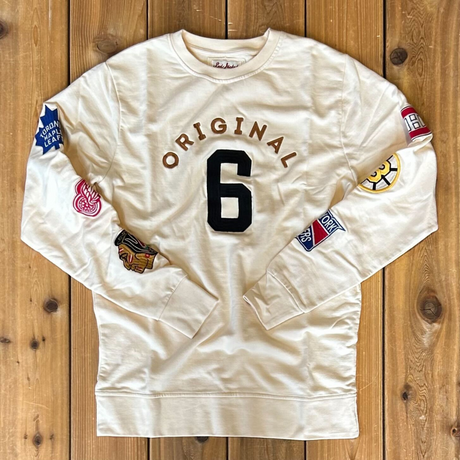 Exclusively ours. The Original Six NHL era began with the demise of the Brooklyn Americans in 1942 and lasted until the 1967 NHL expansion. For those 25 years, only 6 teams played in the NHL: the Toronto Maple Leafs, Montreal Canadiens, Boston Bruins, Detroit Red Wings, Chicago Blackhawks, and Detroit Red Wings. This beautiful, heavy-weight long sleeve commemorates the Original Six era featuring and features applique and embroidered Original 6 name and all six team logos.