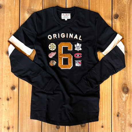 Exclusively Ours. Our best-selling style is back with a new look! The Original Six era defined hockey history. Beginning in 1942 after the demise of the Brooklyn Americans and lasting until the NHL’s 1967 expansion, the league was home to just six teams: the Toronto Maple Leafs, Montreal Canadiens, Boston Bruins, Detroit Red Wings, Chicago Black Hawks, and New York Rangers. This heavyweight long sleeve commemorates that golden age, featuring appliqué and embroidered “Original Six” lettering along with all six iconic team logos.