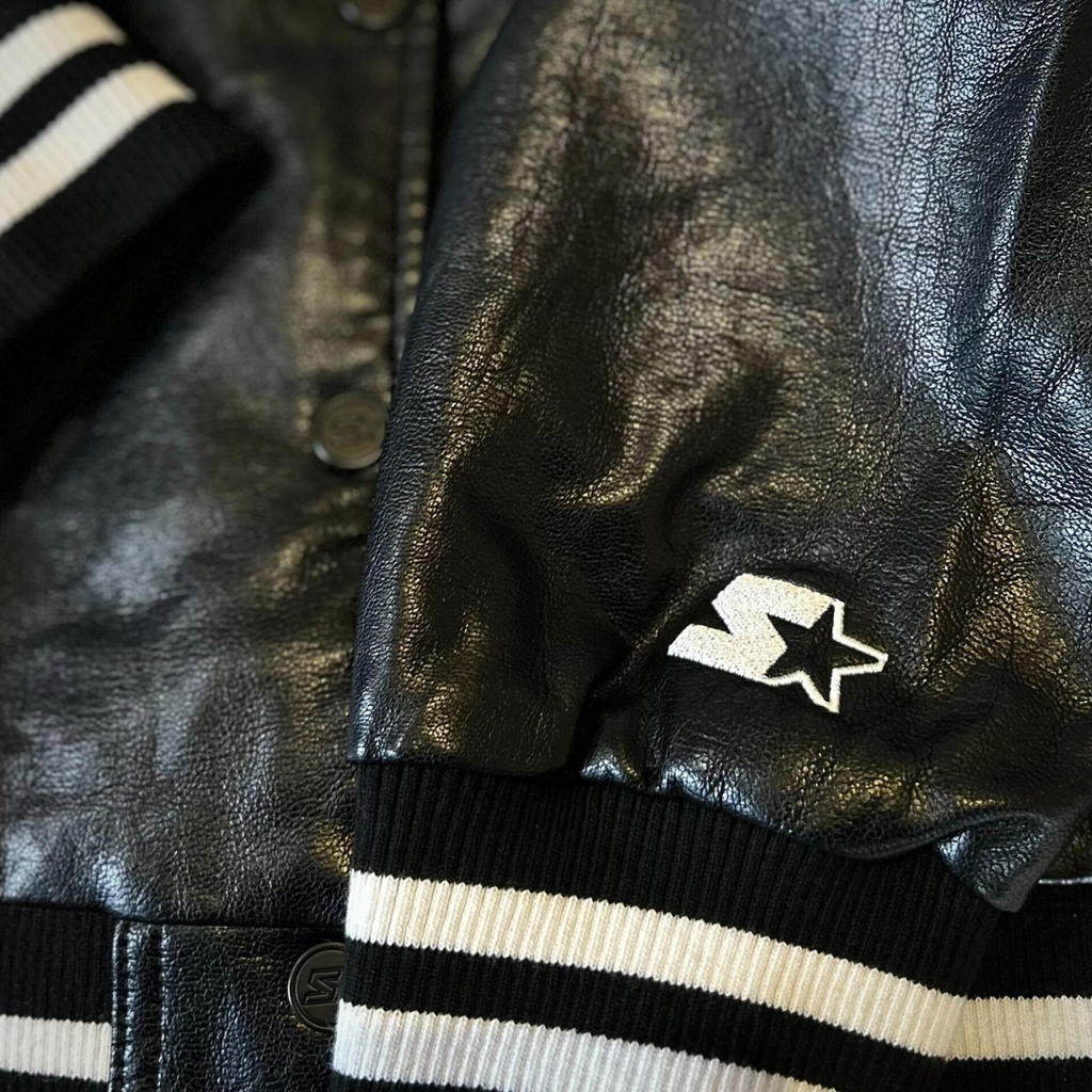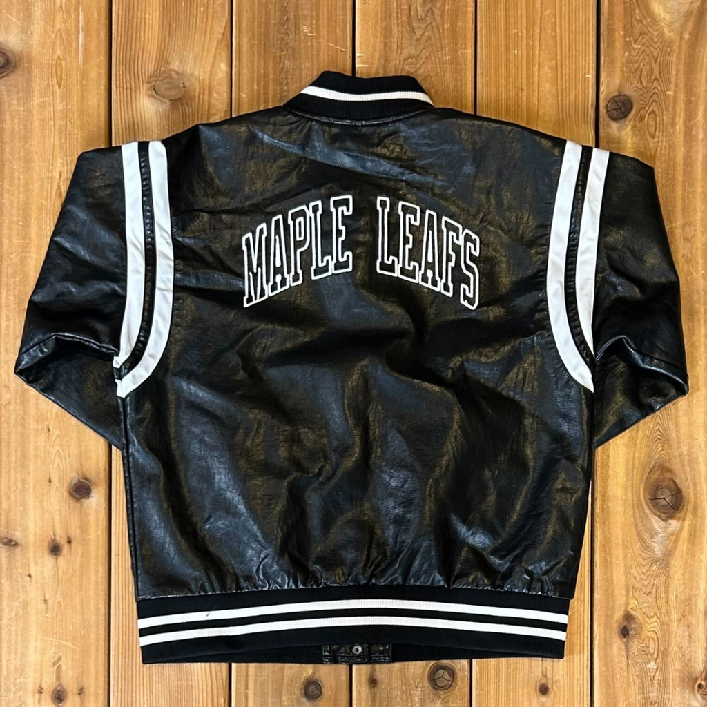 Show your Leafs pride in style. This black vegan leather jacket features a relaxed boyfriend fit with vintage white striped ribbing for a classic varsity look. An applique team logo decorates the chest, with embroidered lettering on the back.