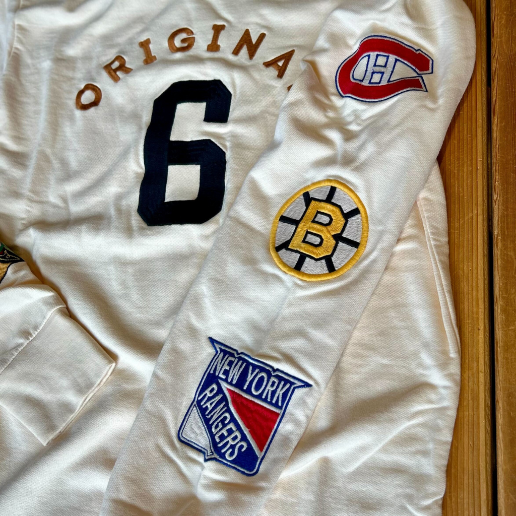 Exclusively ours. The Original Six NHL era began with the demise of the Brooklyn Americans in 1942 and lasted until the 1967 NHL expansion. For those 25 years, only 6 teams played in the NHL: the Toronto Maple Leafs, Montreal Canadiens, Boston Bruins, Detroit Red Wings, Chicago Blackhawks, and Detroit Red Wings. This beautiful, heavy-weight long sleeve commemorates the Original Six era featuring and features applique and embroidered Original 6 name and all six team logos.